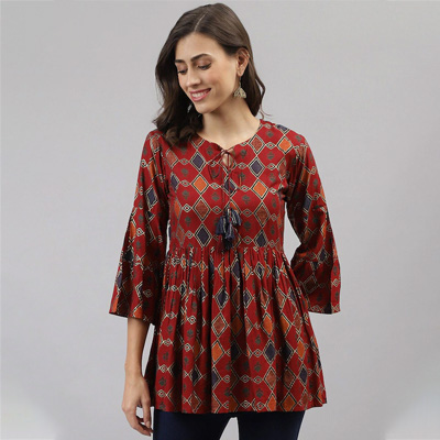 Maroon and navy blue printed tunic ,has a round neck, three-quarter sleeves.