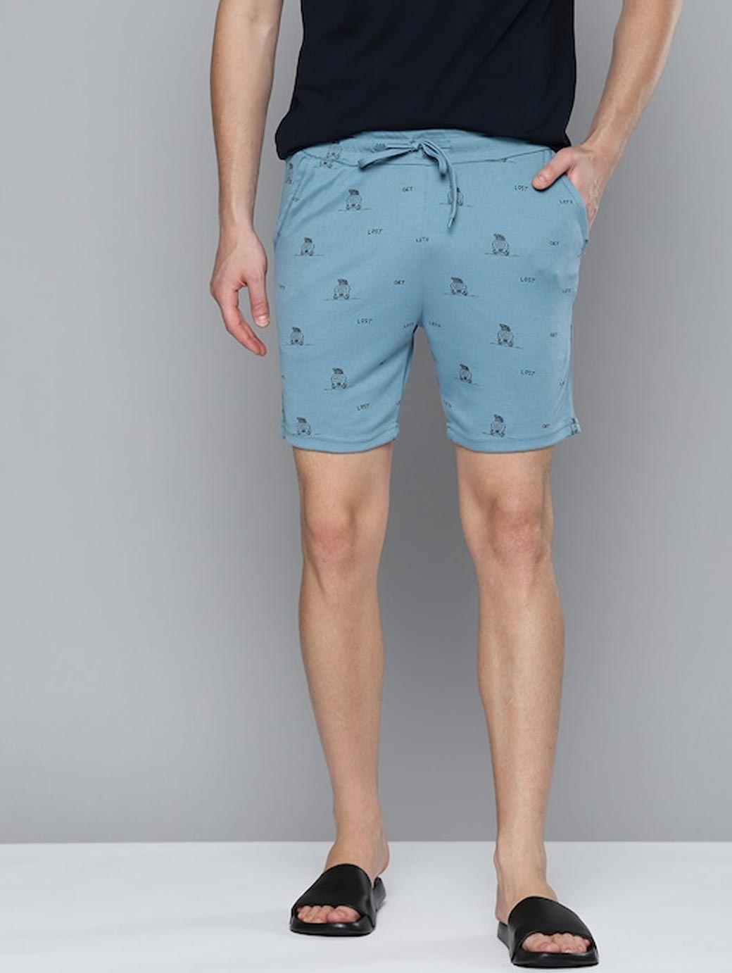 A pair of blue mid-rise printed knitted lounge shorts, has inner elastic waistband with drawstring closure, 4 pocket