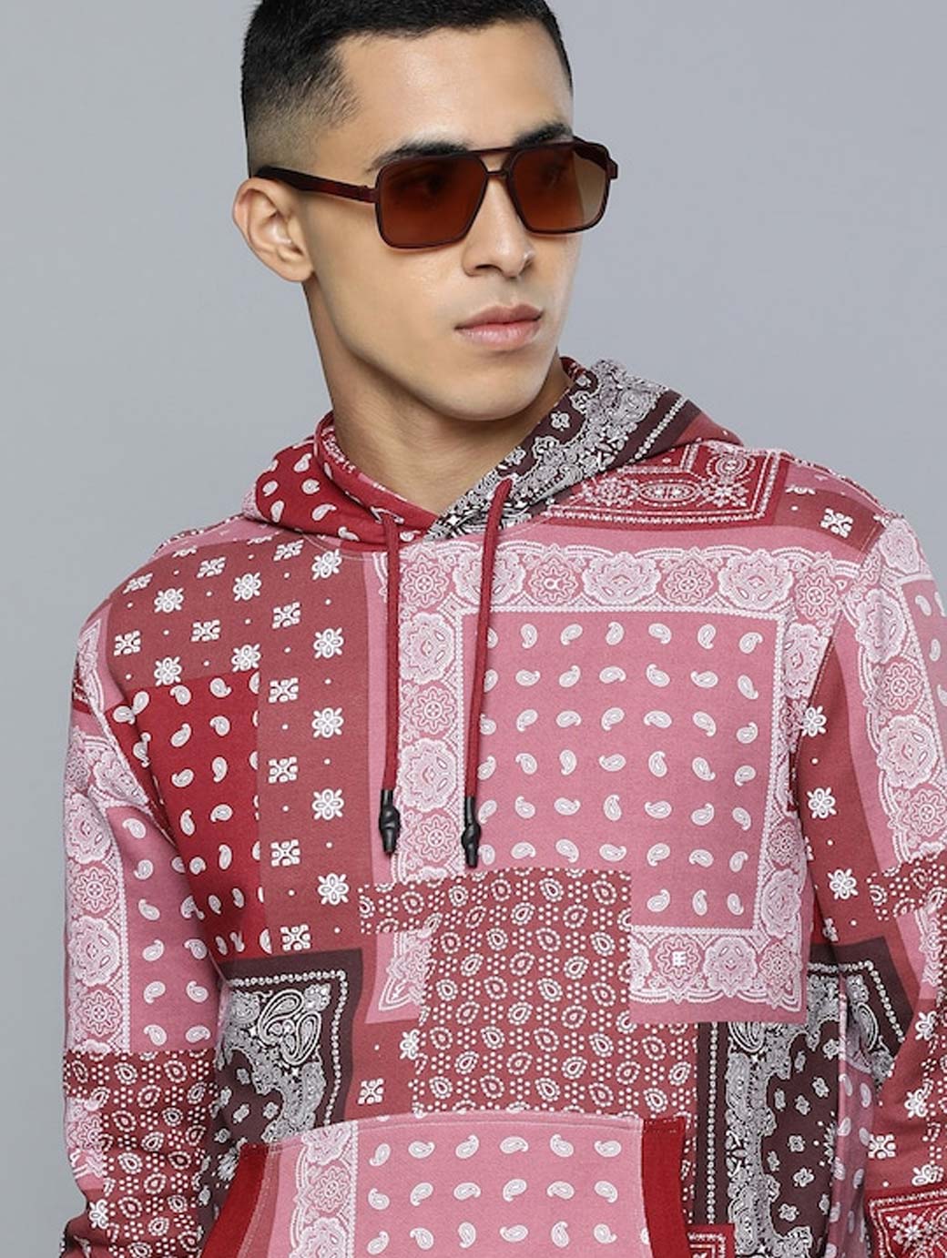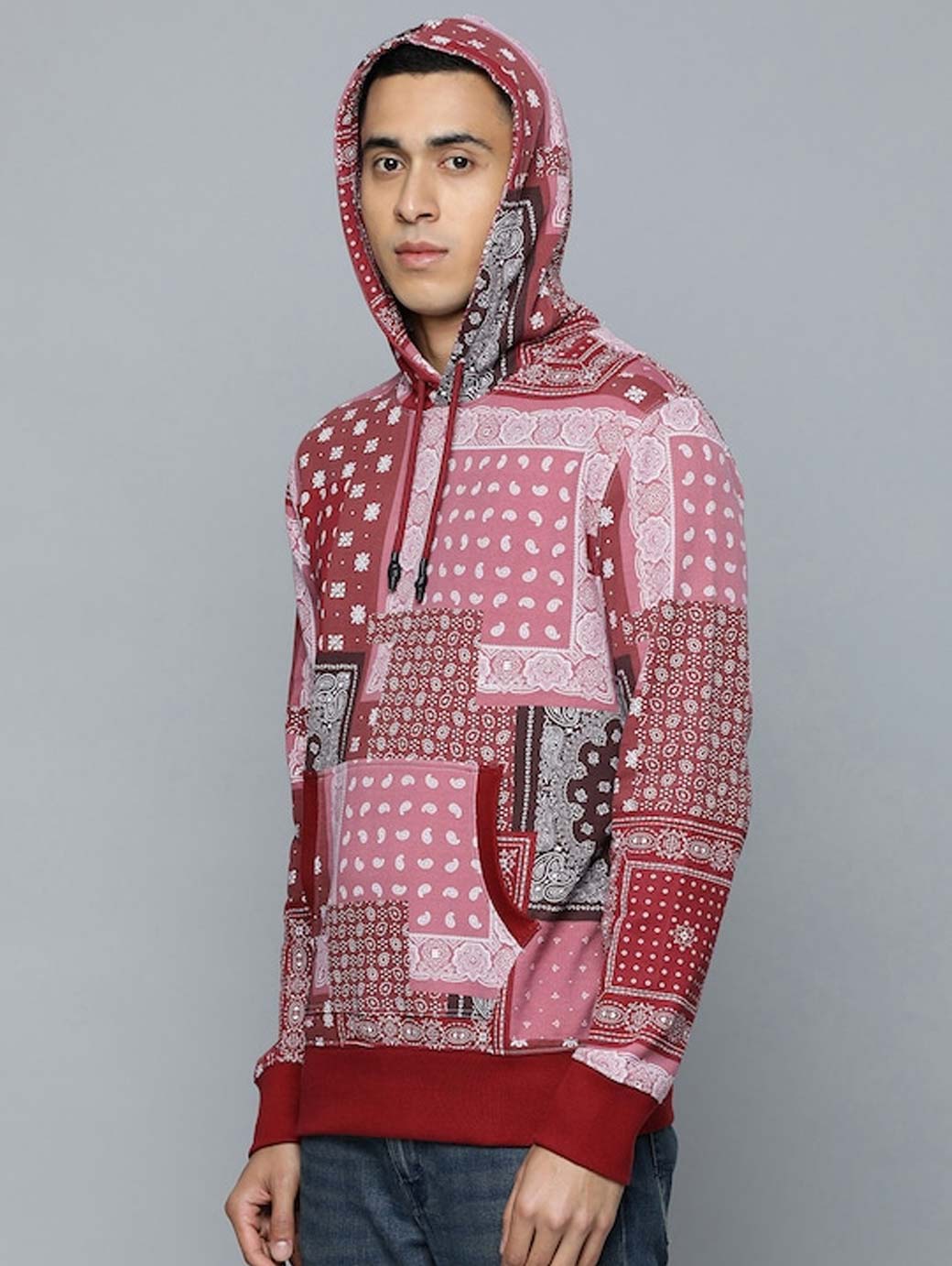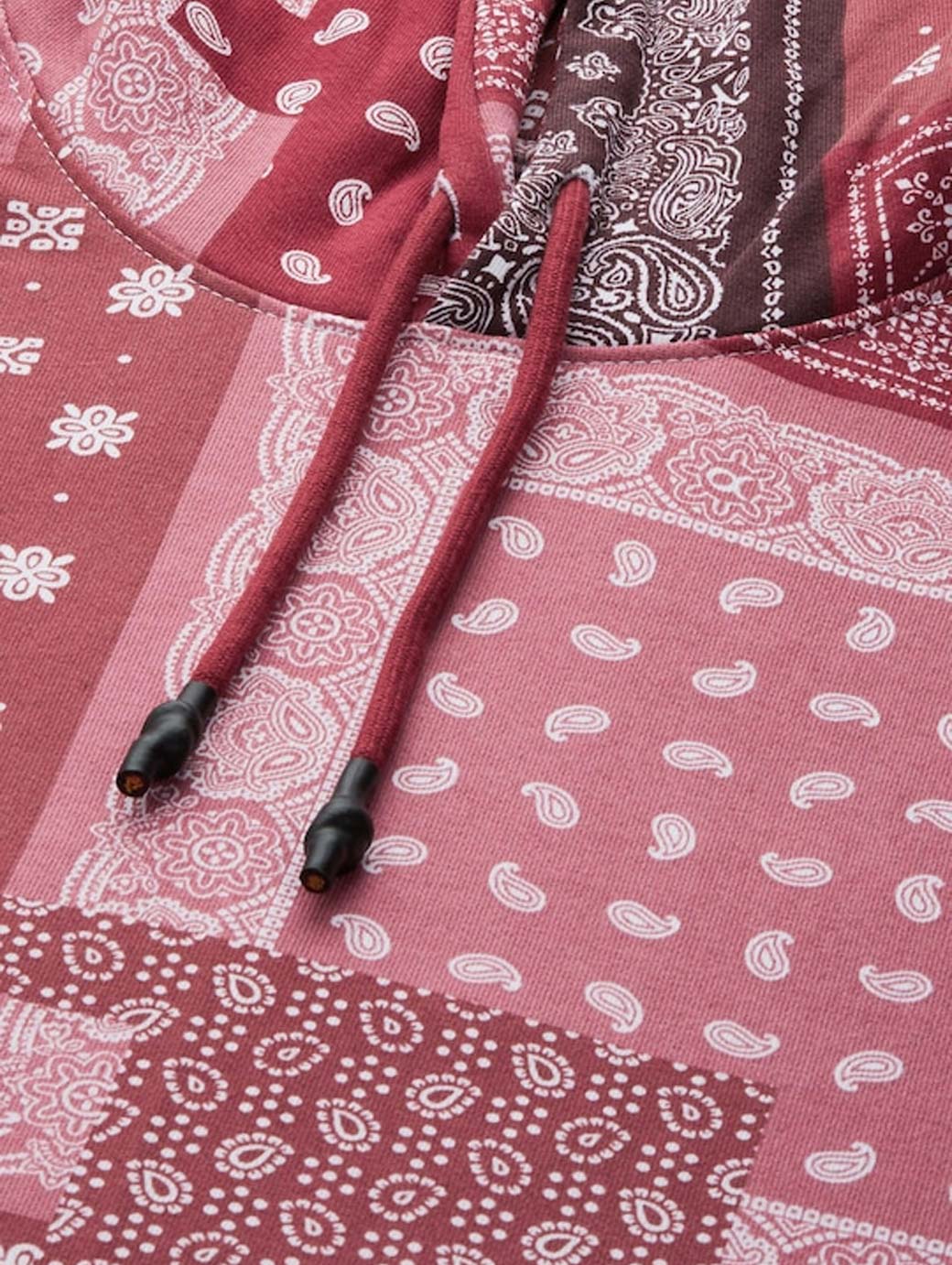Red & pink printed sweatshirt has a hood, 1 kangaroo pocket, long sleeves, ribbed hem