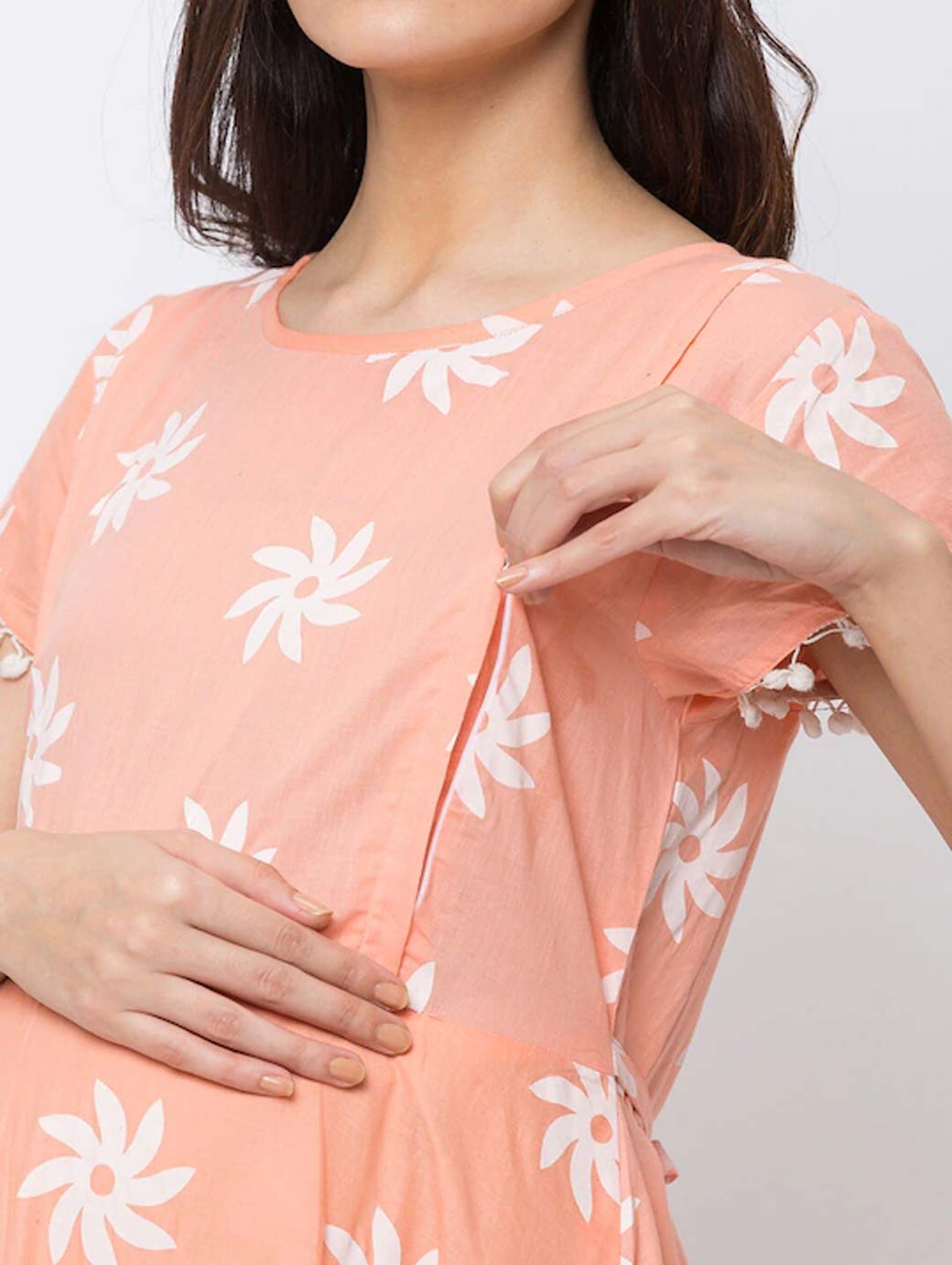 Peach-Coloured printed woven fit and flare maternity dress, has a round neck, short sleeves, concealed zip closure, and flared hem