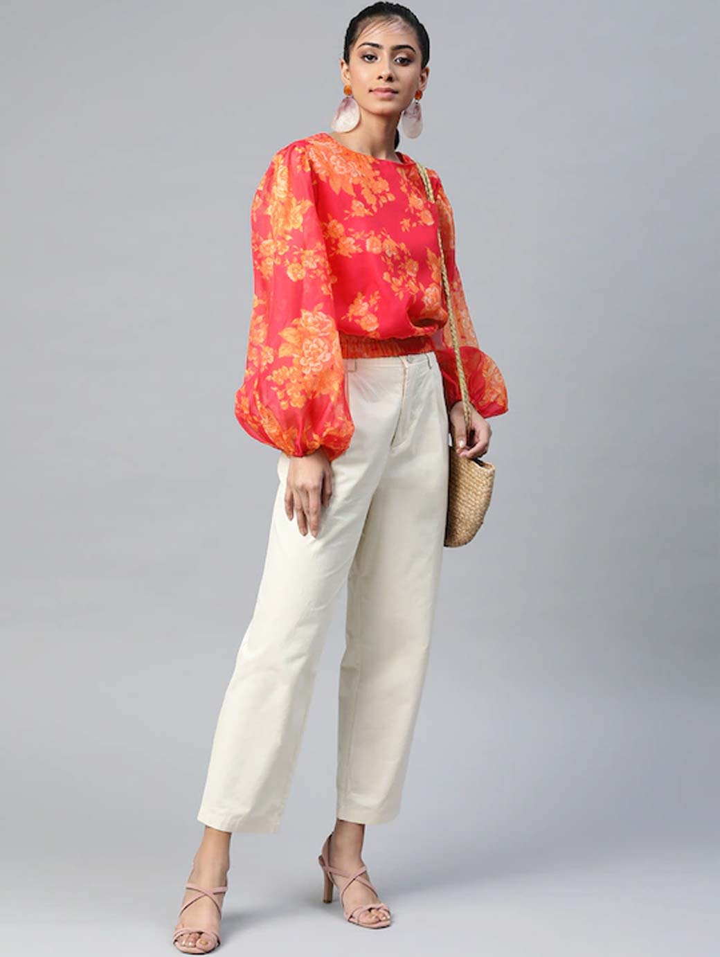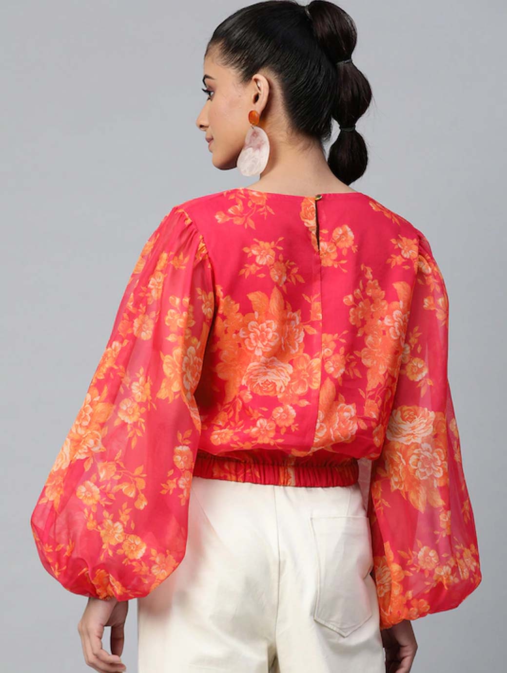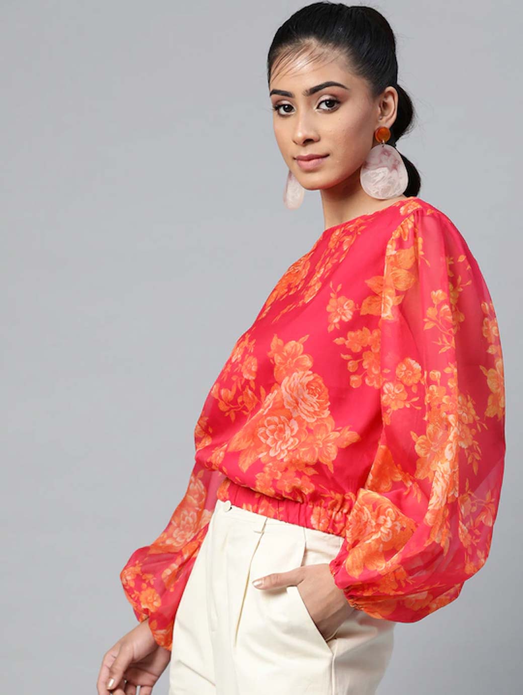 Pink blouson Top, printed woven. round neck, long puff sleeves, gathered or pleated, button closure, an attached lining, elasticated hem.