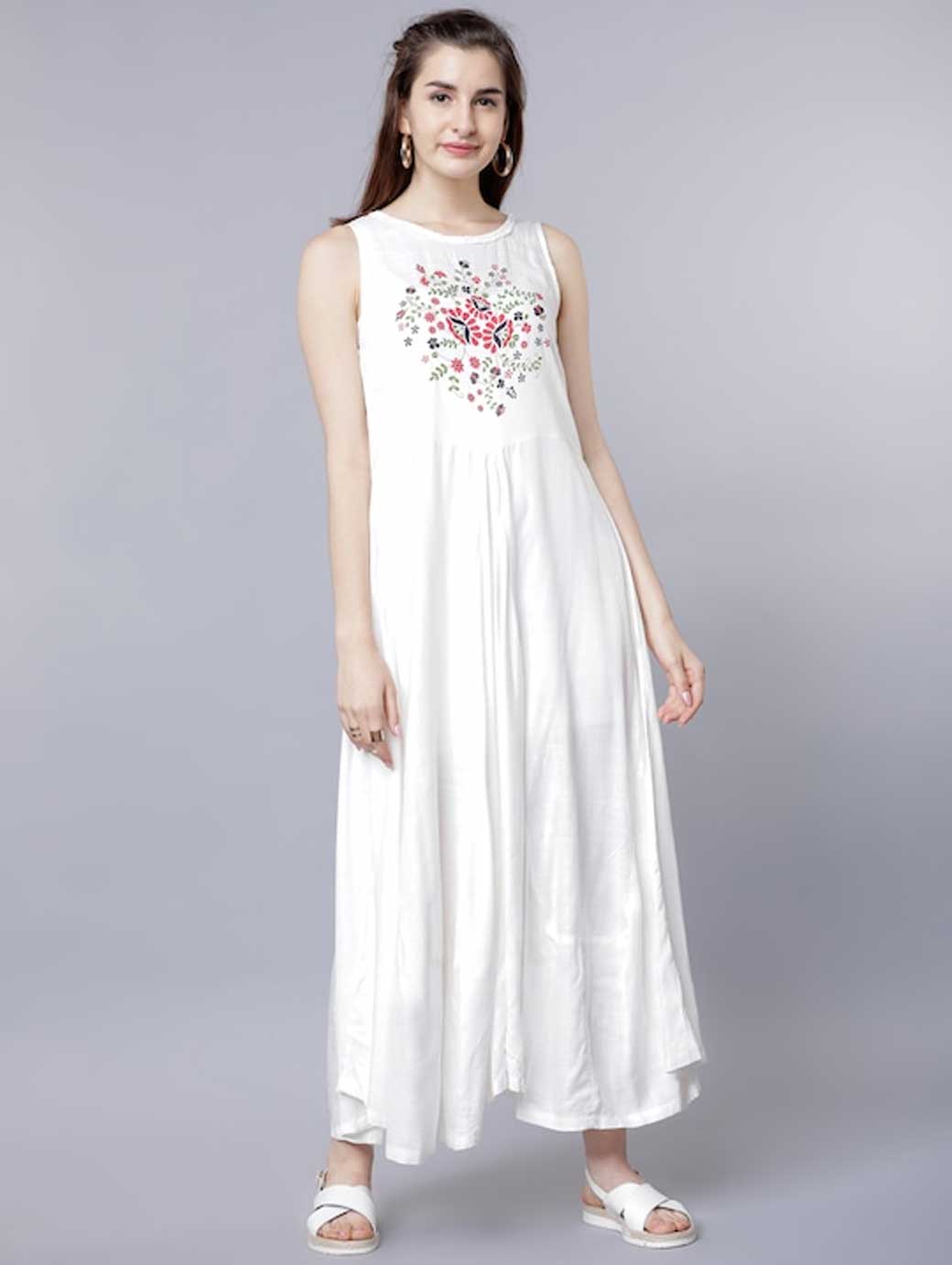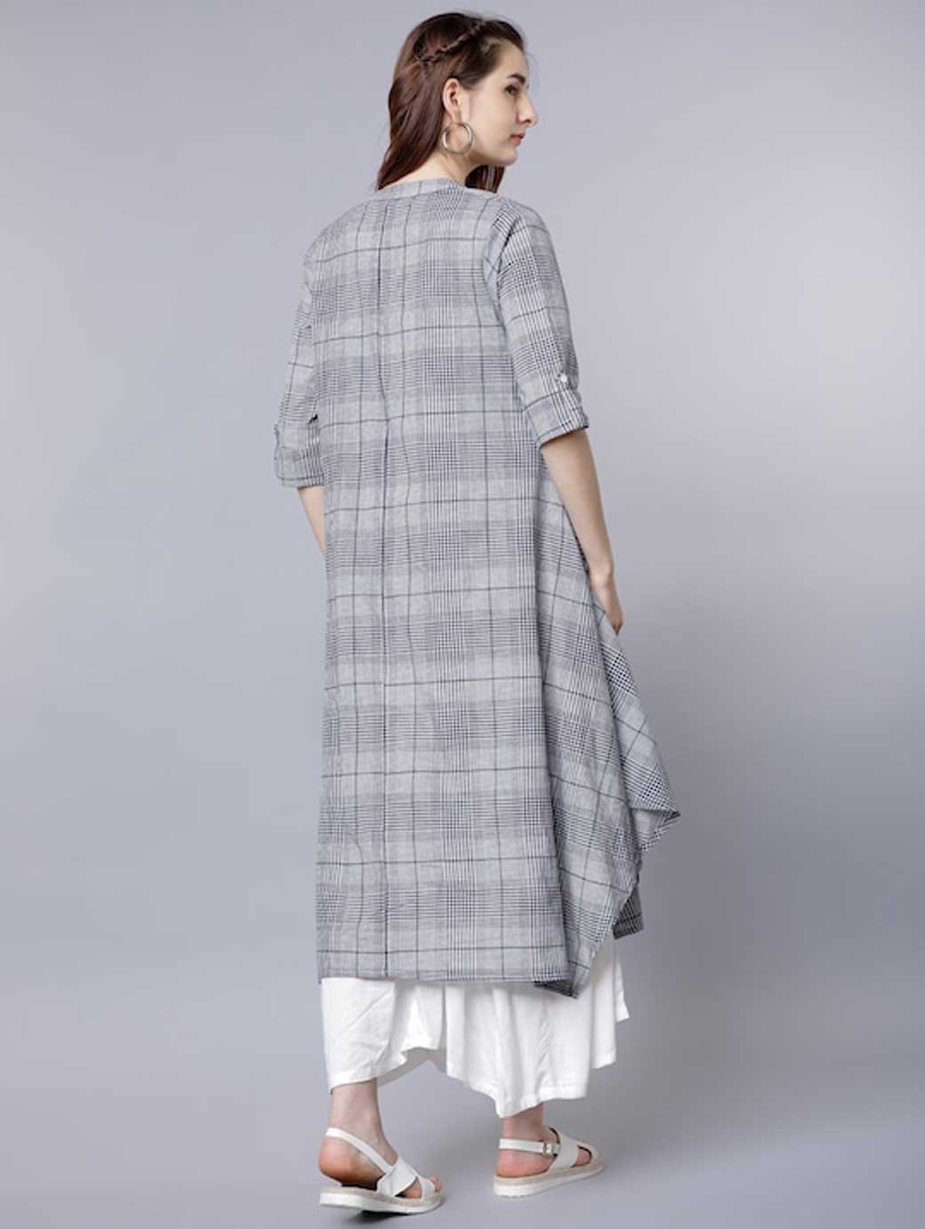 Floral print a-line dress Mandarin collar Three-quarter, regular sleeves Layered detail Maxi length in flared hem Comes with a open front checked jacket