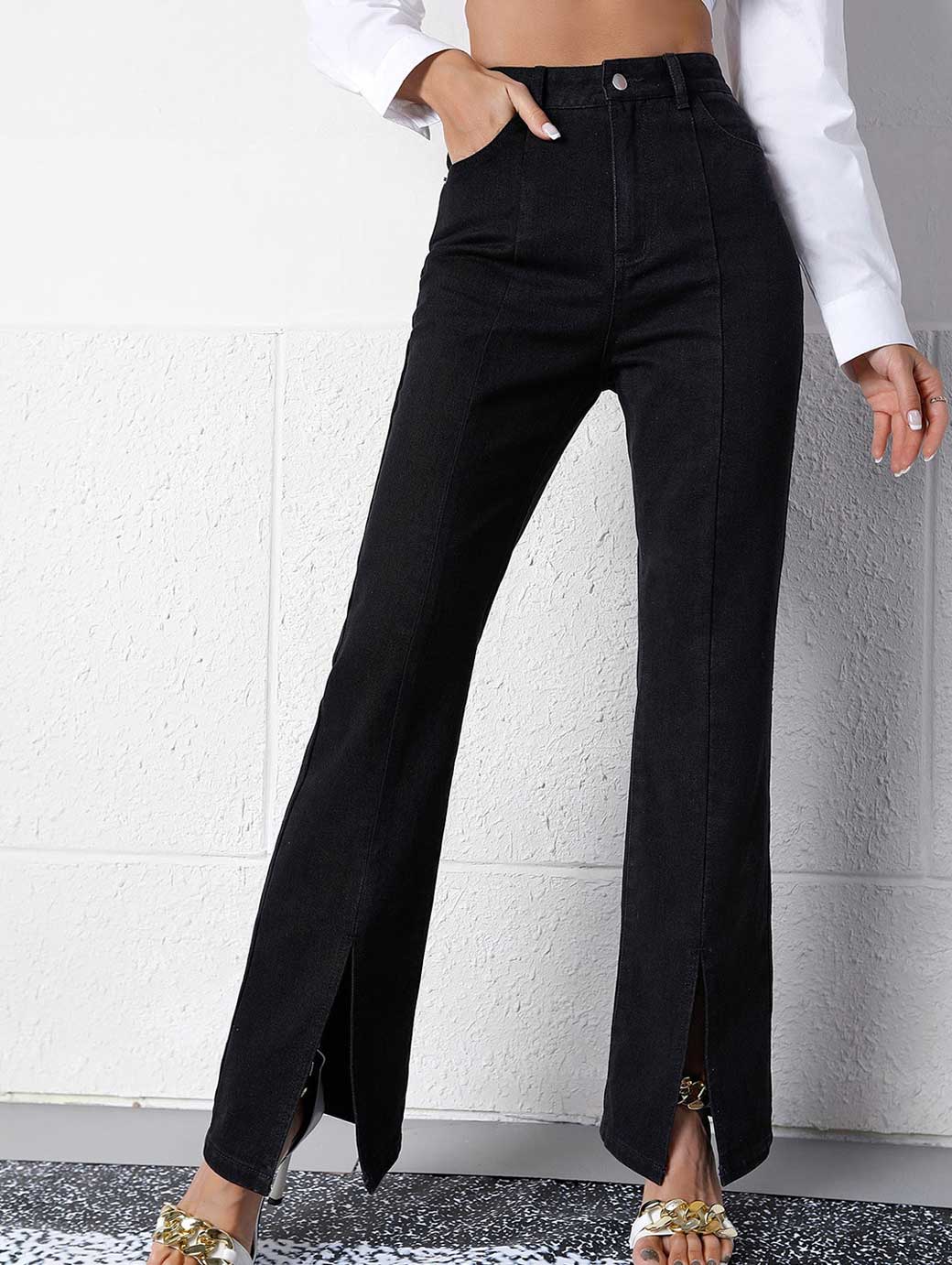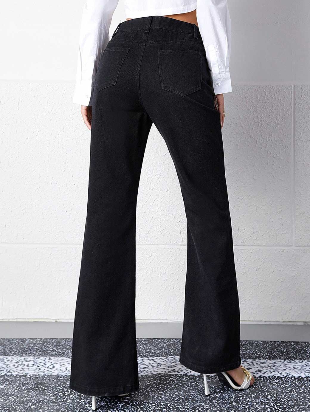 Dark shade, no fade black jeans Wide leg, mid-rise Clean look Non stretchable 5 pocket Length: regular