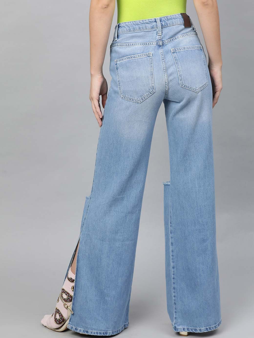Blue light wash 5-pocket mid-rise jeans, slash knee, light fade, has a button and zip closure, and waistband with belt loops