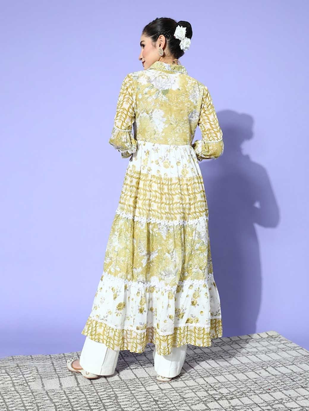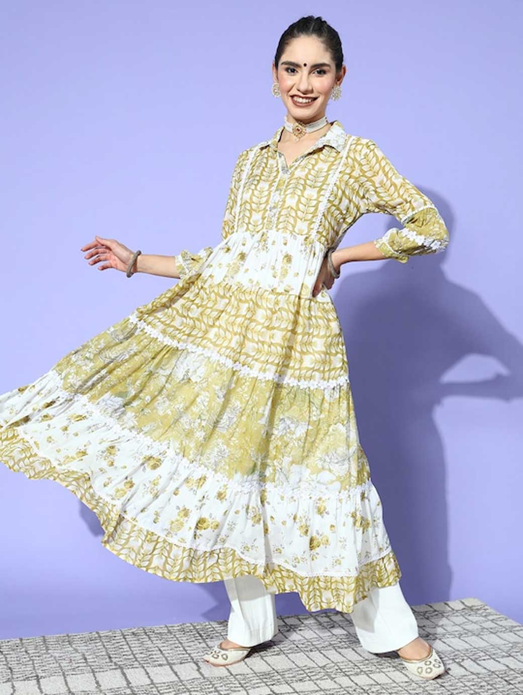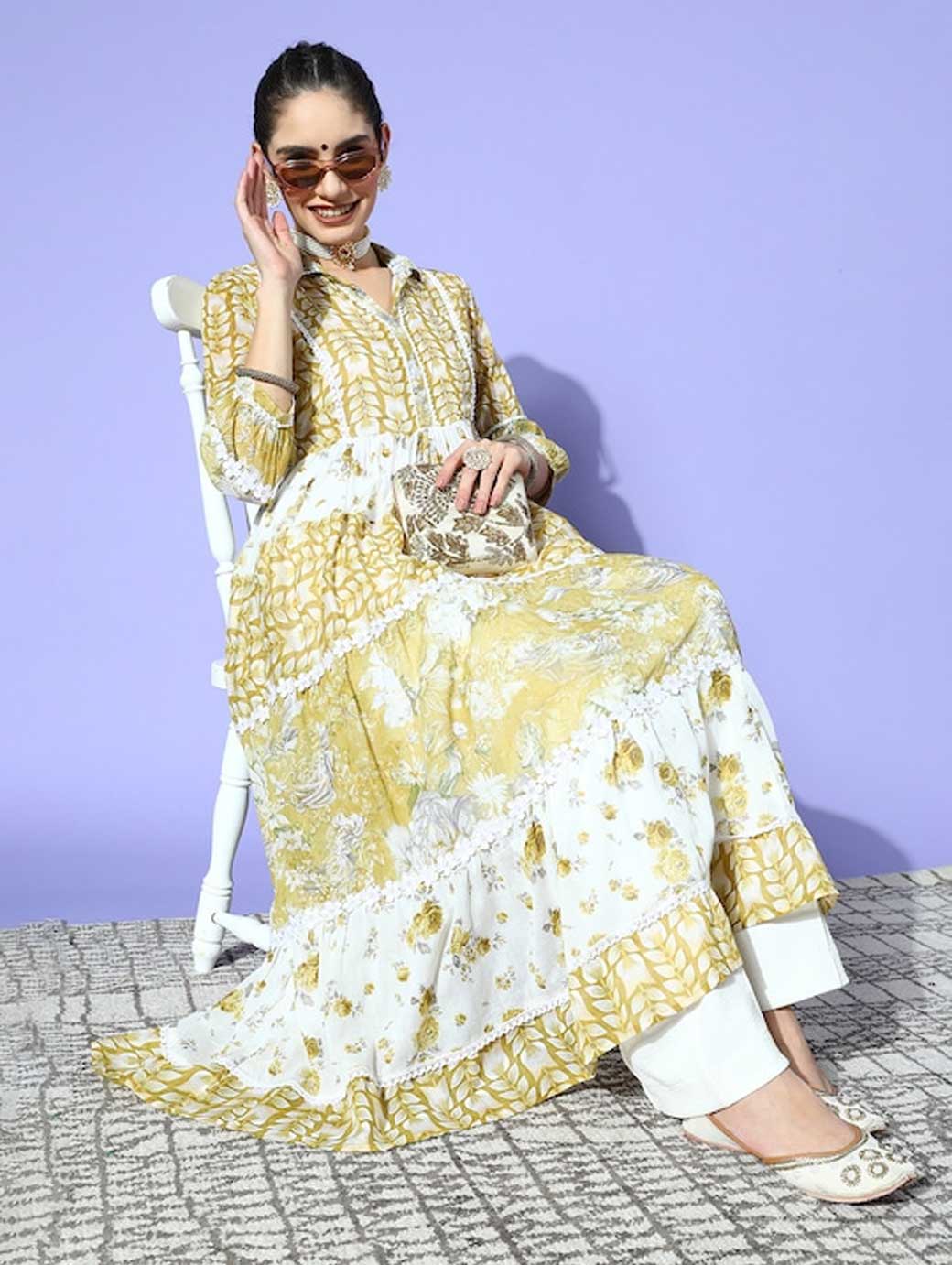 Become a trendsetter when you walk out of the house in this kurta. Designed with an alluring flared hemline and ankle length, this attractive kurta will lend you a traditional look. Elegant olive shade Three-quarter puff sleeves Flared hemline Ankle length Cotton, dry clean Trend Alert With gathered volumes, tiers, pleats, bias drapes, and swaying silhouettes, the volumes trend is a mix of whimsical and playful femininity. It plays with beautiful prints and patterns, such as floral, pastel colour-blocking, embroidered, Nu Noheme, floral all-over print, ombre, rich gold foil print, porcelain blooms, and so on.