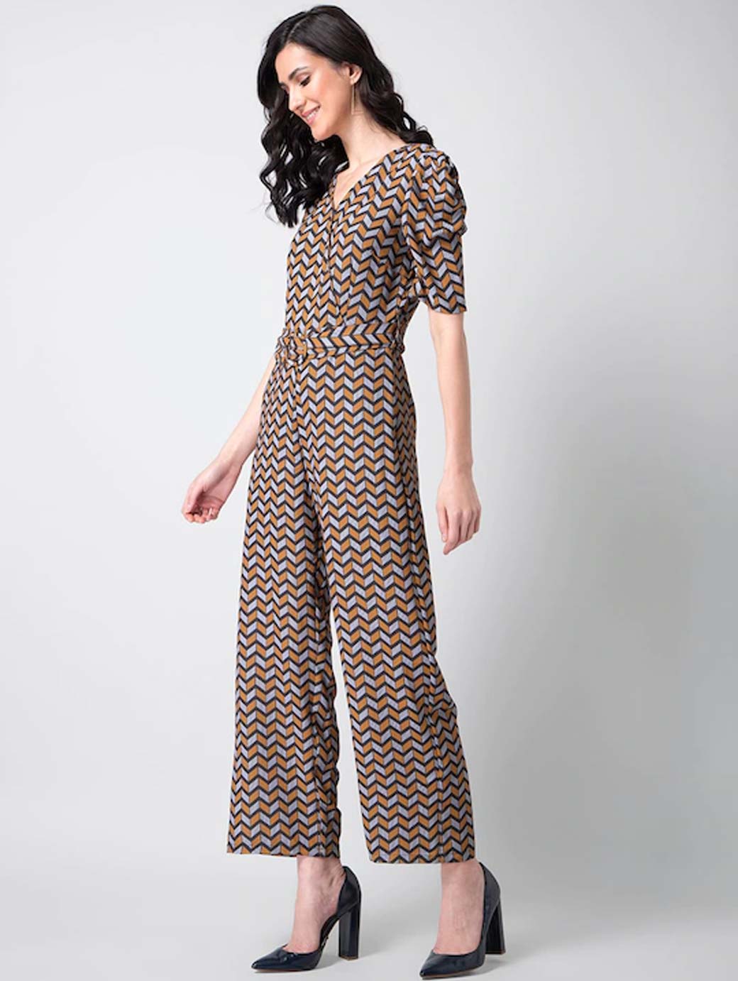 Women Mustard Yellow & Grey Printed Basic Jumpsuit