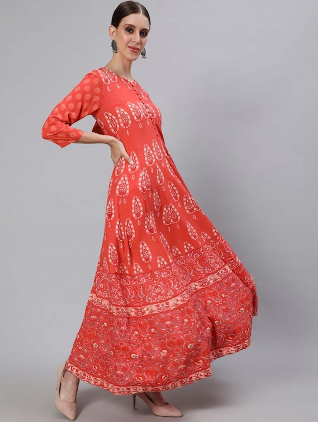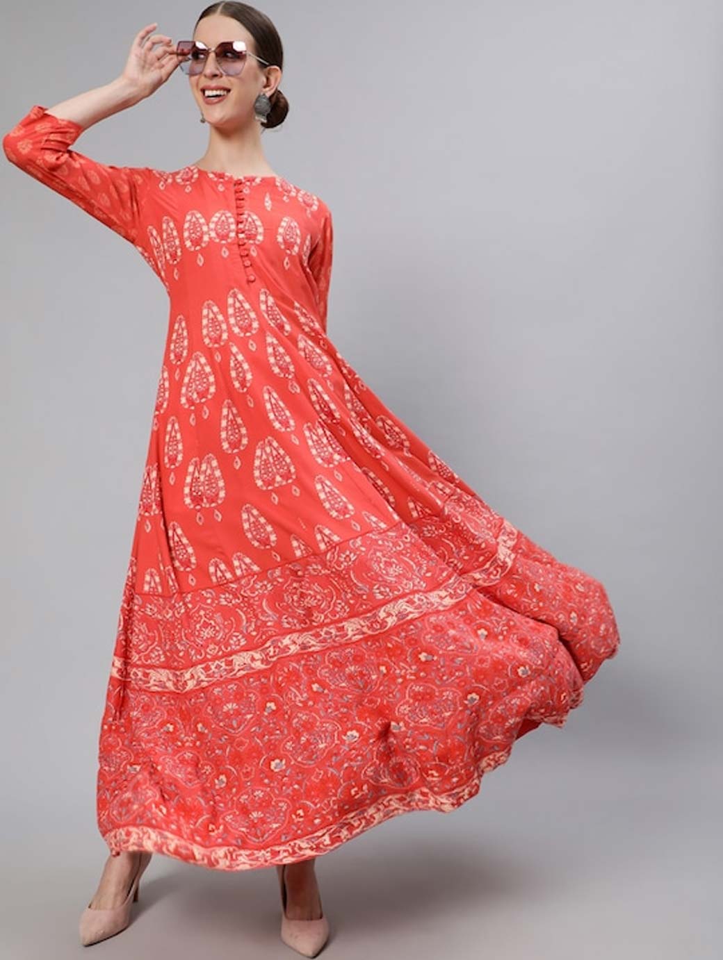 Geometric printed Keyhole neck Three-quarter, regular sleeves Anarkali shape with empire style Ankle length with flared hem Machine weave regular cotton
