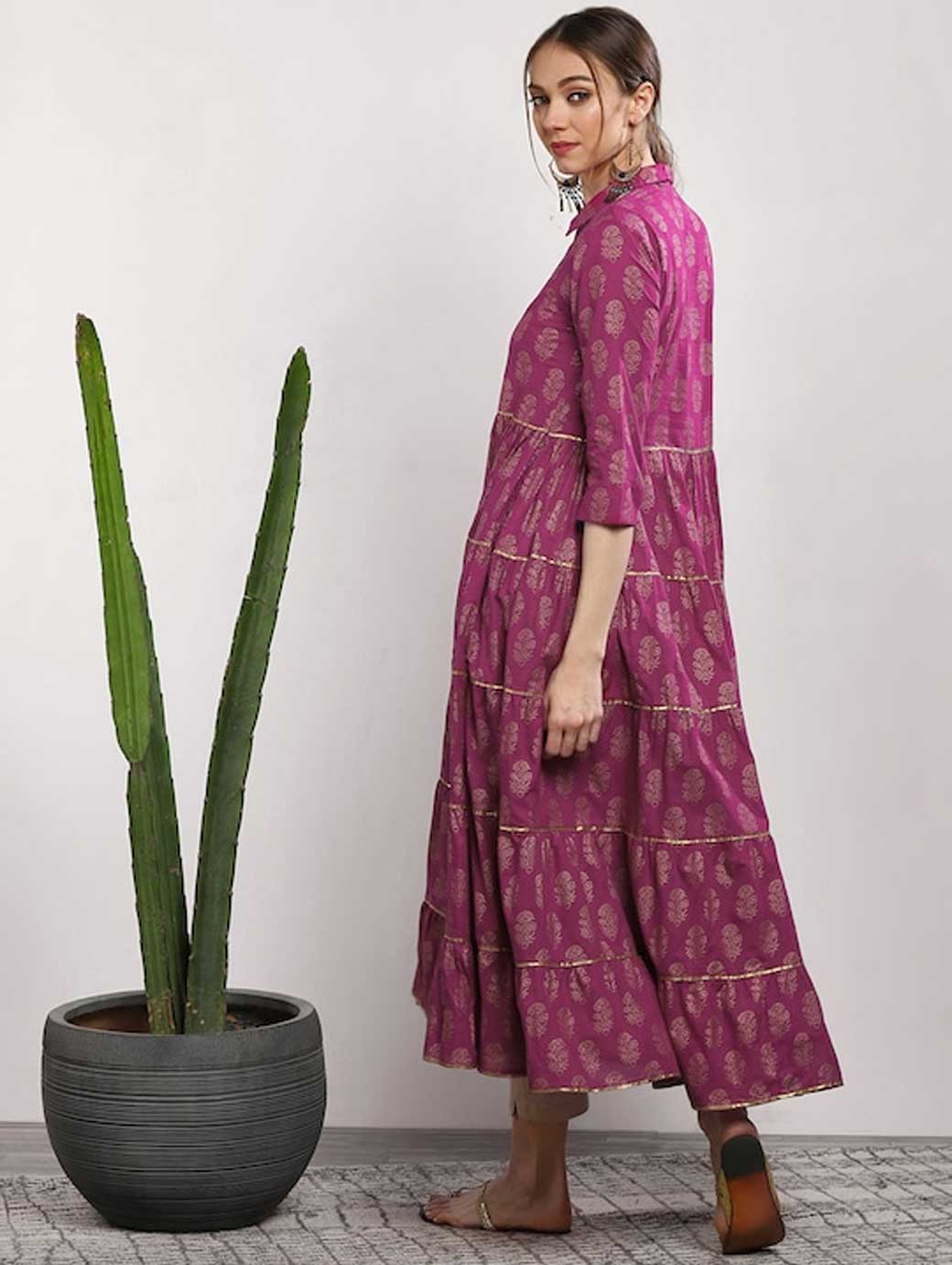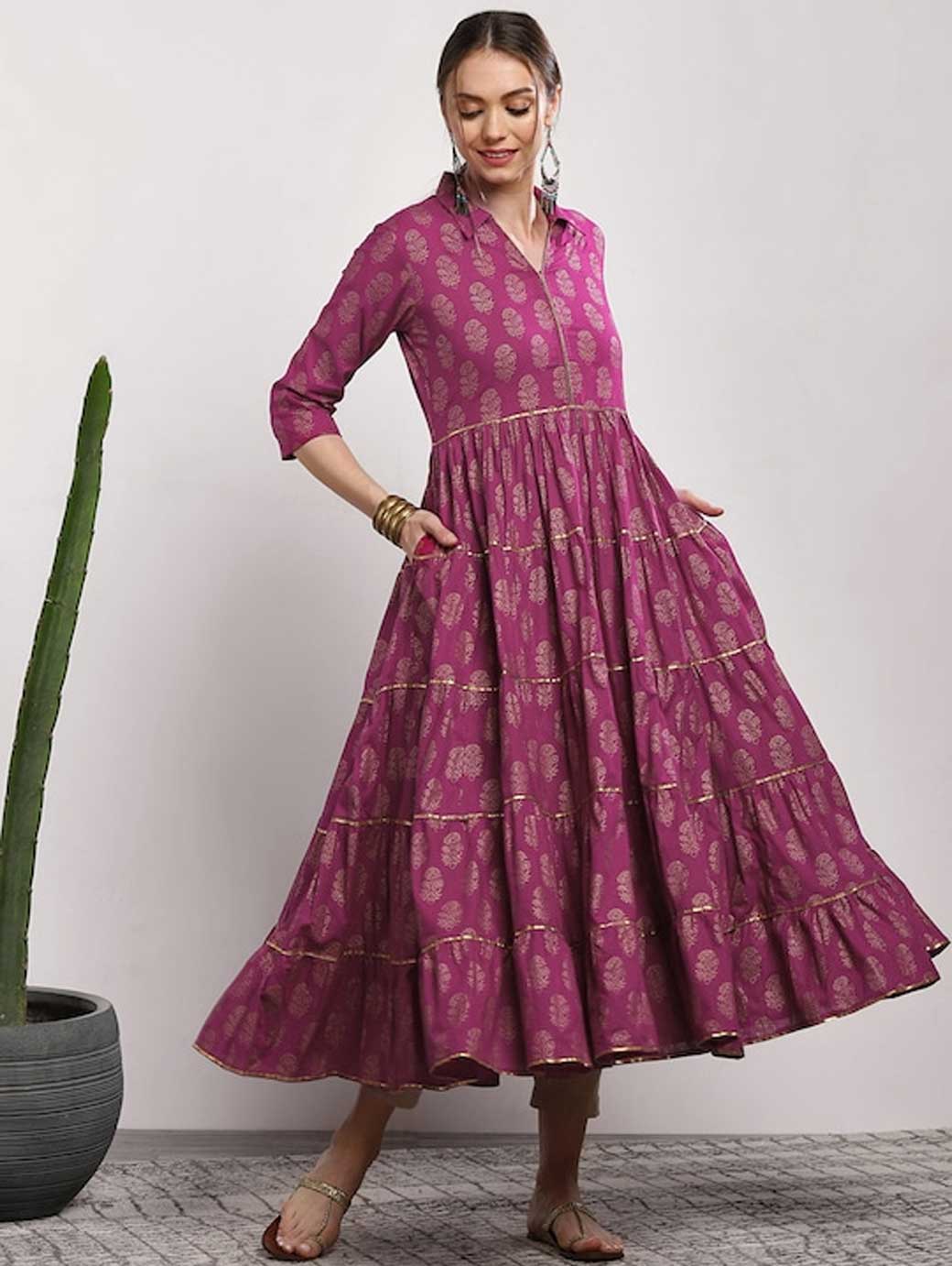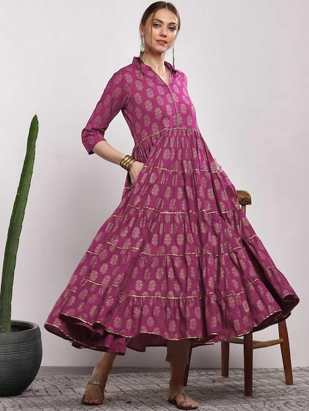 Pink Printed Tiered Anarkali Kurta, has a round neck, three-quarter sleeves, and flared hem.